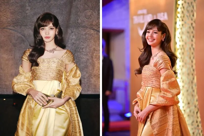 Created and designed by Olivier Rousteing, the masterpiece is adorned with gorgeous gold brocades of Thai silk exquisitely in Yok Thong and chartreuse. This specific Lisa custom Balmain ensemble was meticulously draped to mirror the regal silhouettes favored by the royal court in the mid-20th century. The maison played with the timelessness of local skills by using traditional fabrics in a modern bustier shape with a sweeping train. The appearance was enhanced by ruby-decorated Bvlgari high jewelry and a handmade gold clutch by the local brand Jasmina, so that every element was a glorification of her heritage.