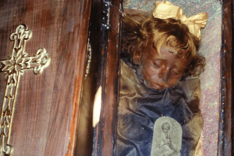 Unlike ancient mummies, Rosalia looks alive in her glass coffin. She has porcelain skin, blonde curls with a silk bow, and half-open blue eyes. She has earned the nickname “Sleeping Beauty” for this remarkable realism.